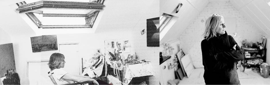 There have been other stop/start times alongside various milestones in my life (like having children) but painting has always been a thread running through my life. I seem to gravitate towards lofty studios with skylights. This photo shows me in 2004 in my top floor flat in Clapham and 20 years later in my studio now.