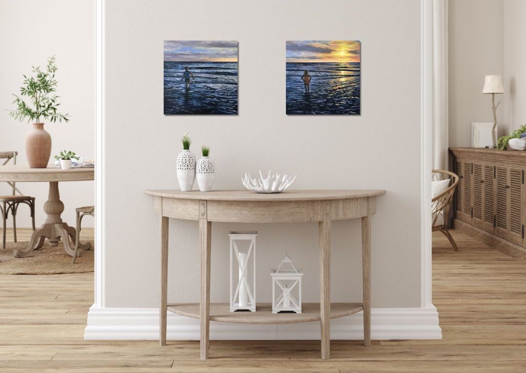 I had been admiring Sonya's seascapes on instagram for a while and then a picture of my son in the sea popped up on my phone.I thought it would be a perfect picture for Sonya to paint. I then found another picture of my daughter in the sea and thought it would be lovely to have two paintings of my children in the sea. Sonya captures the sea and the sunset perfectly. Such a talented artist!