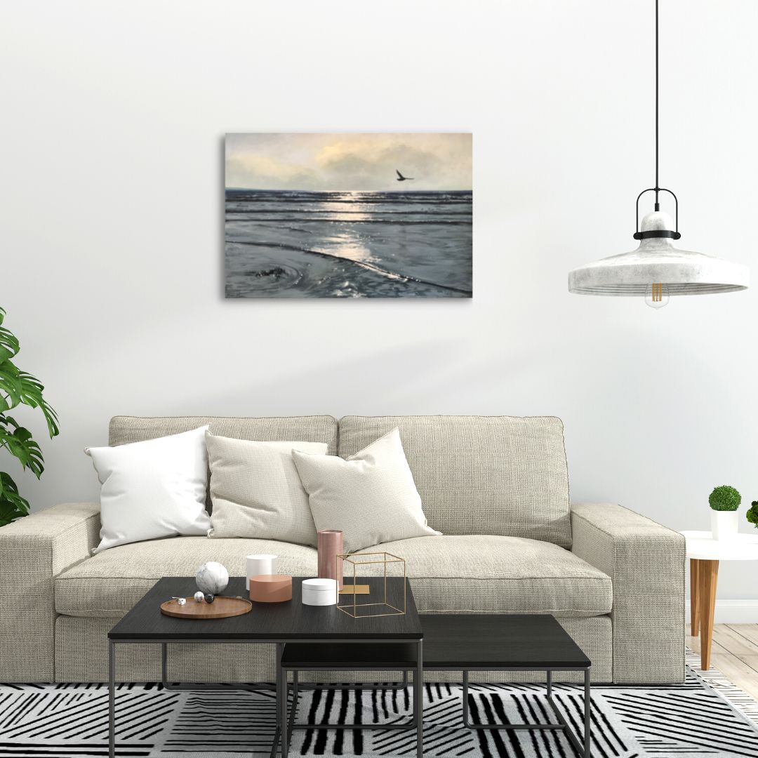 This is an original Sonya Vine painting, oil on canvas, 20" x 30". Signed by the artist on the front and signed and dated on the back. No need to frame as it is on stretched canvas (1.5" deep) and can hang on the wall as it is.
