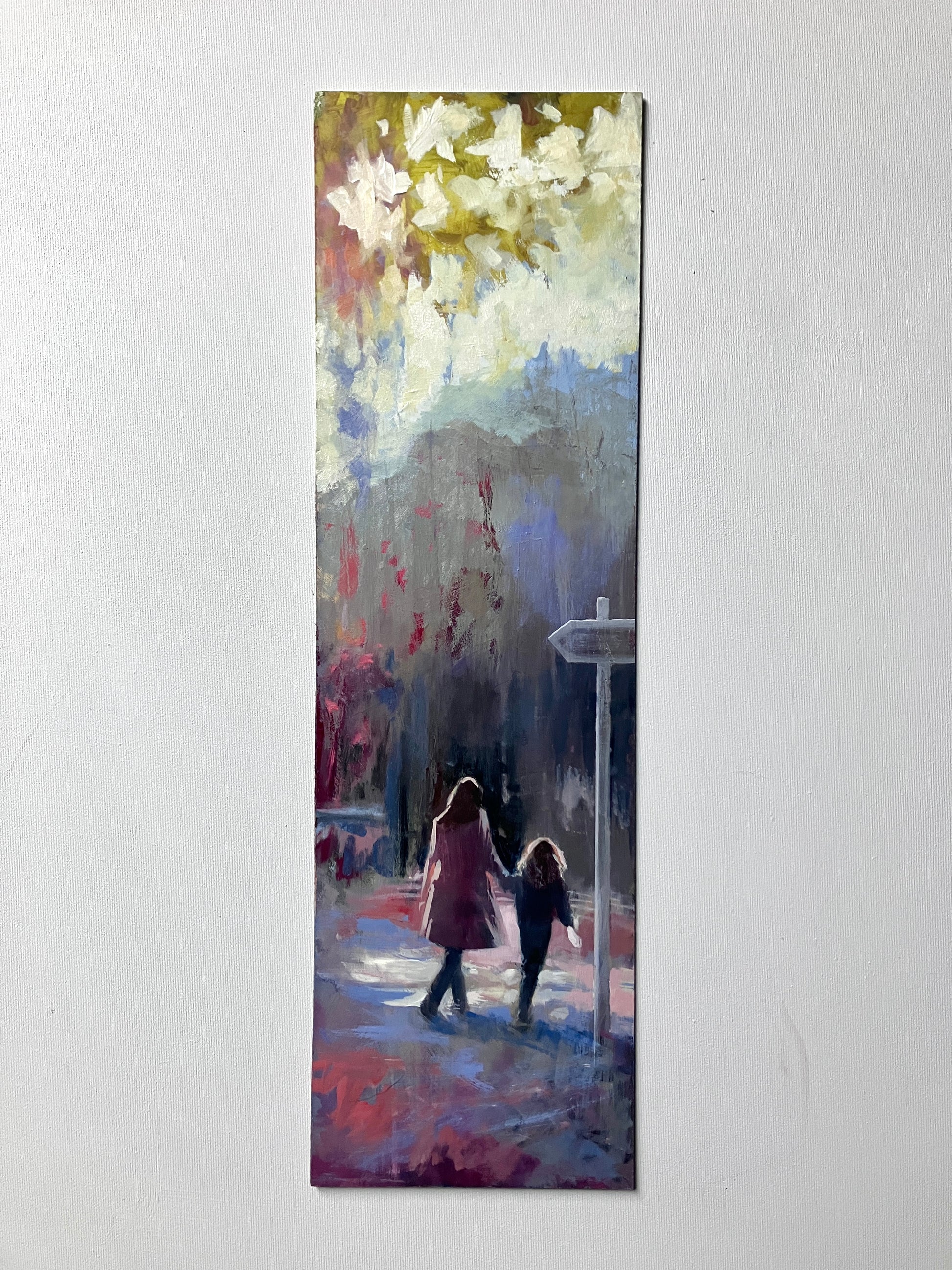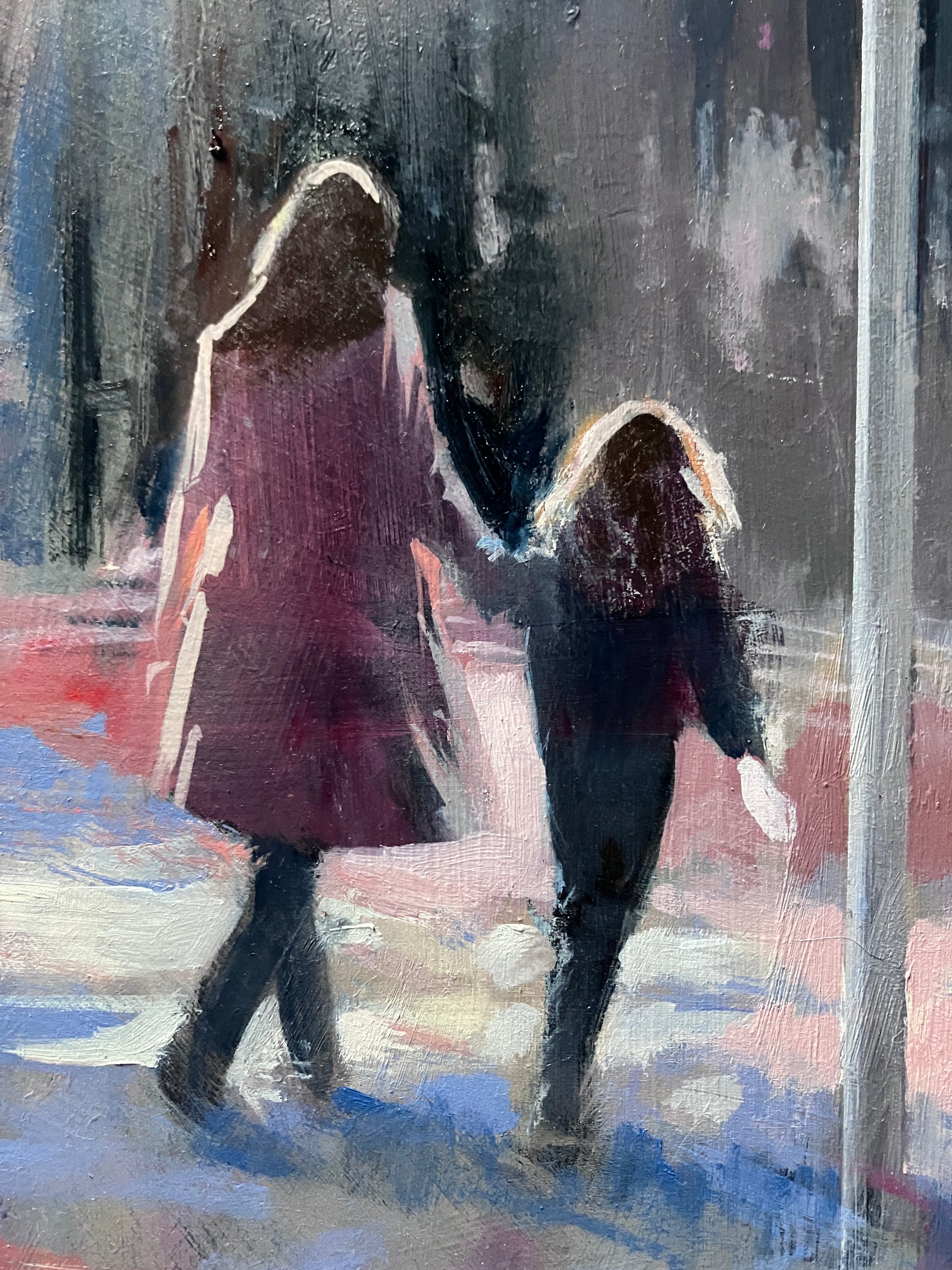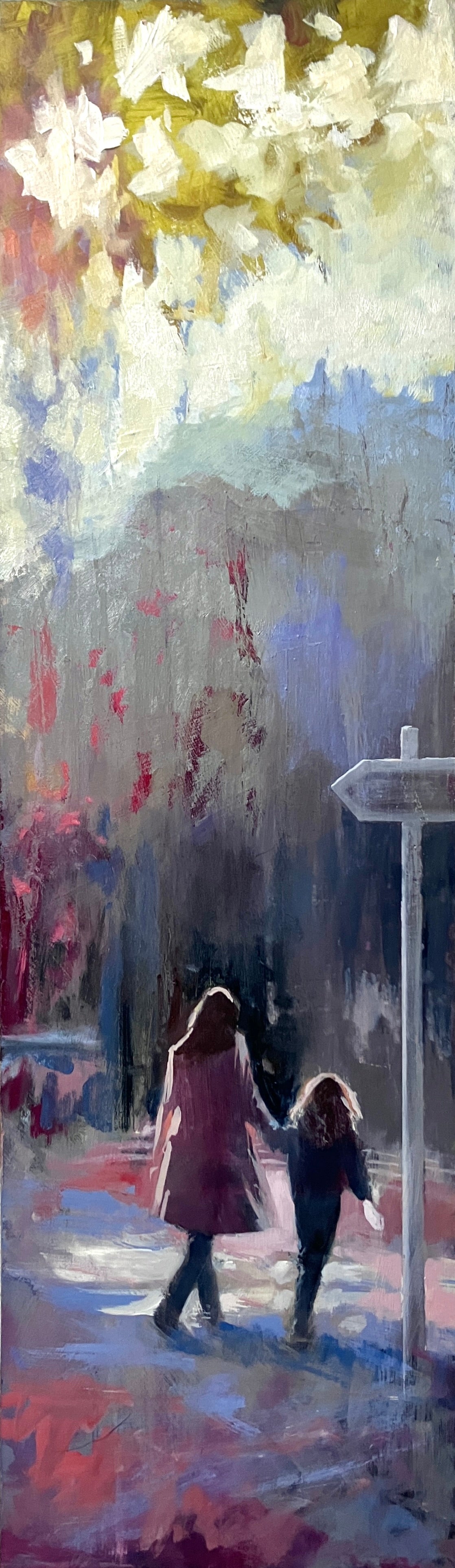 This painting captures a quiet mother and daughter moment, walking together beneath a wide, shifting sky. I wanted to keep the brushwork loose to give it a transient feel, like it might all disappear in an instant while keeping the scene soft and open, letting emotion lead more than detail. It’s about connection and that feeling of heading somewhere without quite knowing where, just together.