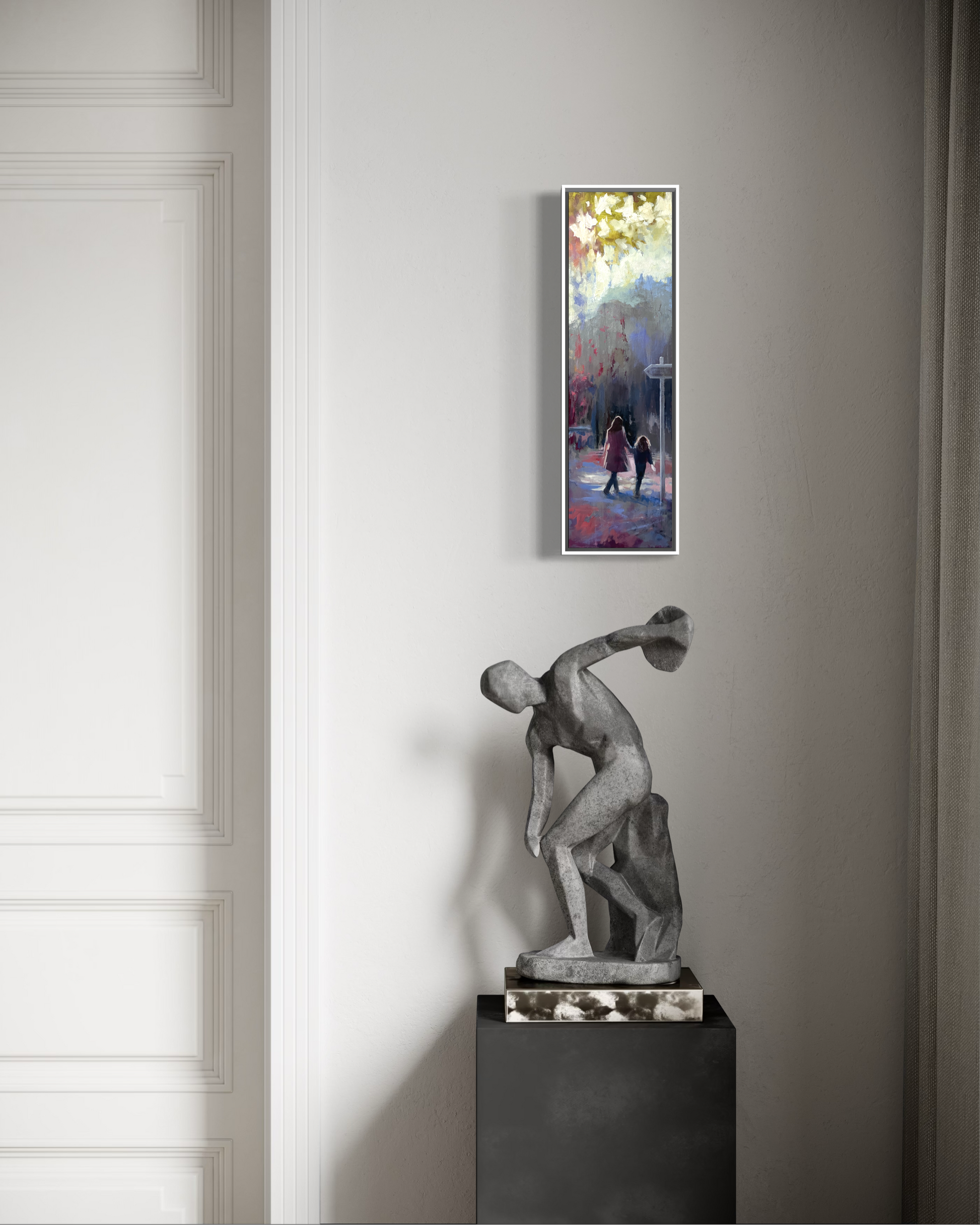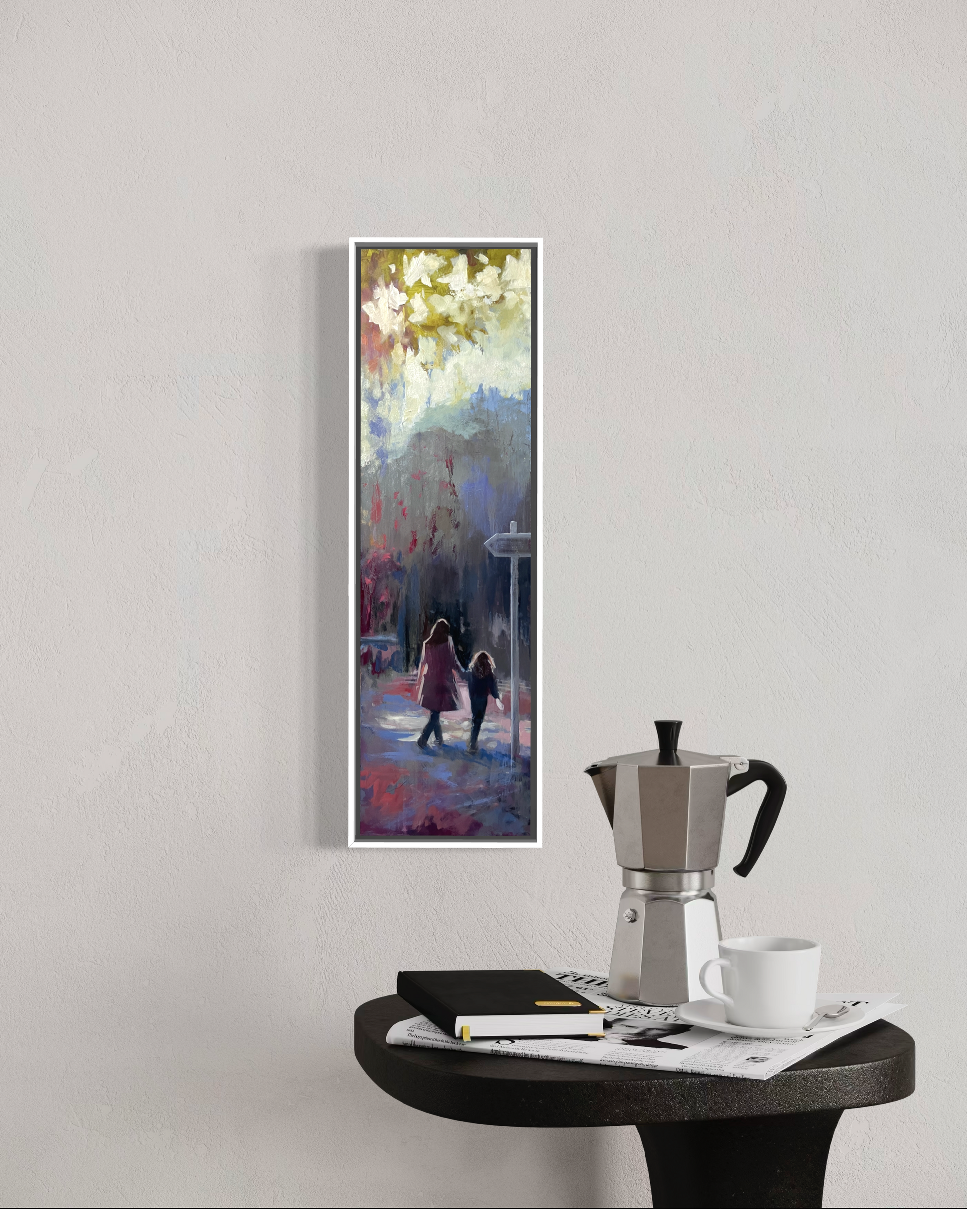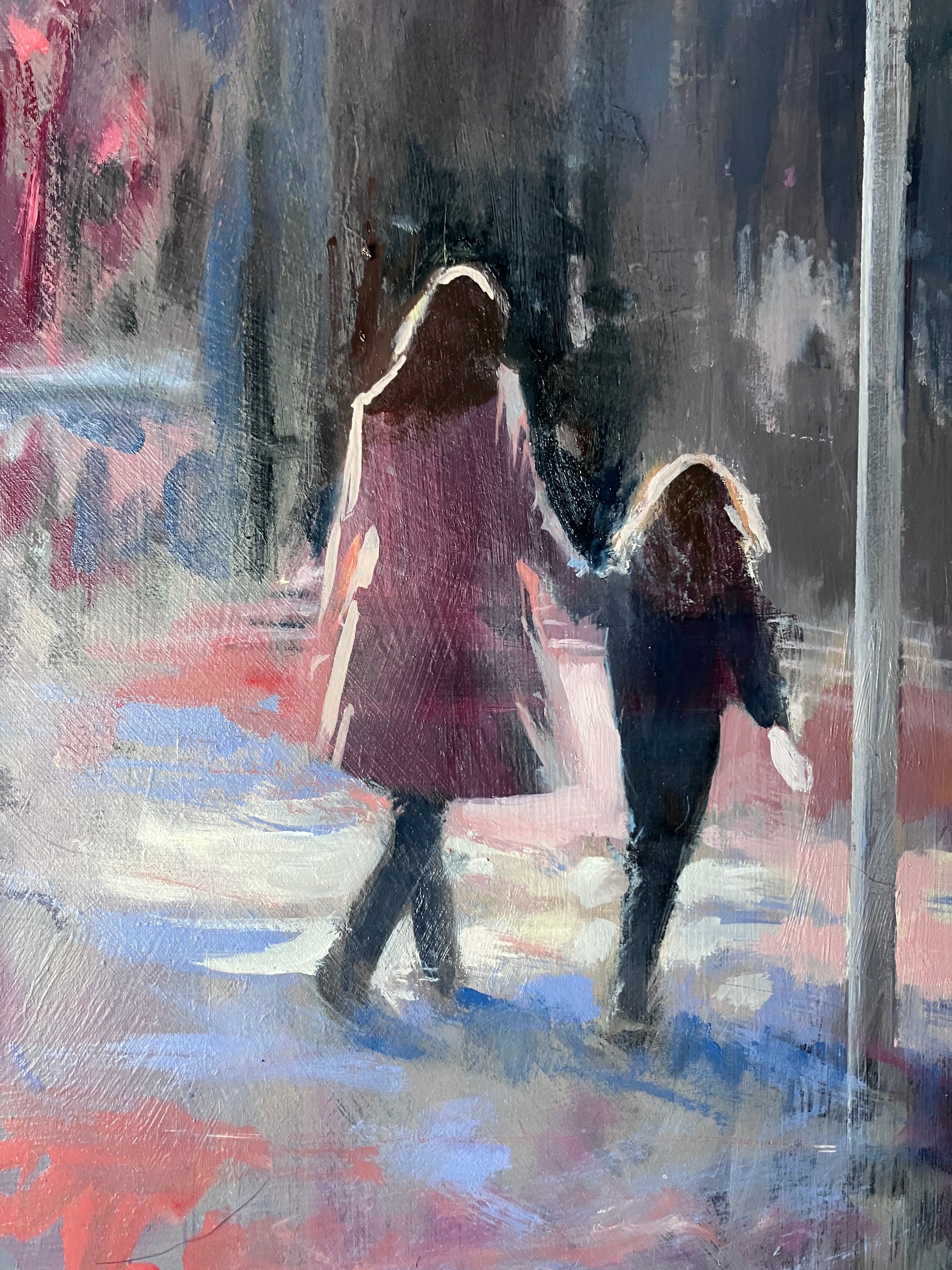 This painting captures a quiet mother and daughter moment, walking together beneath a wide, shifting sky. I wanted to keep the brushwork loose to give it a transient feel, like it might all disappear in an instant while keeping the scene soft and open, letting emotion lead more than detail. It’s about connection and that feeling of heading somewhere without quite knowing where, just together.