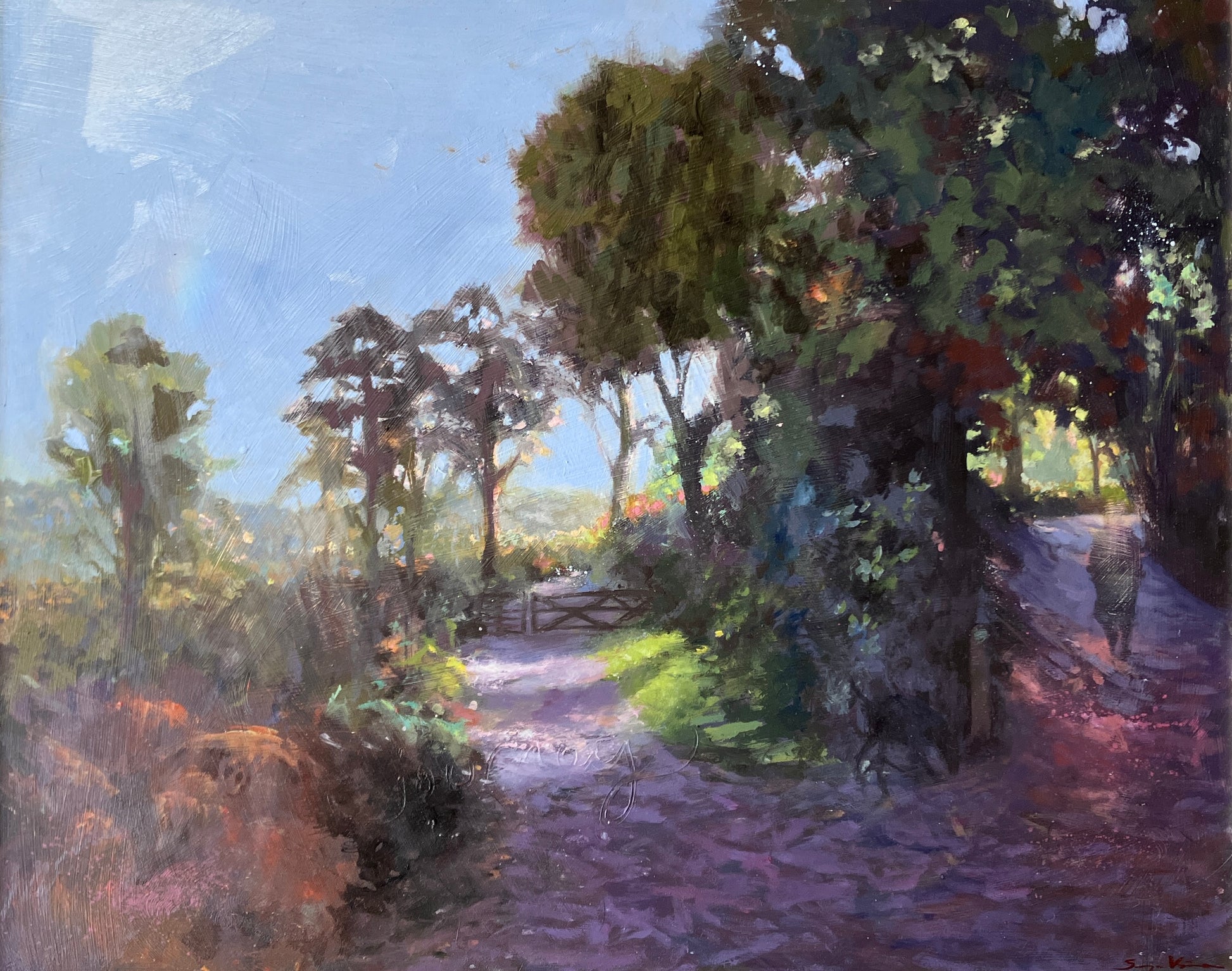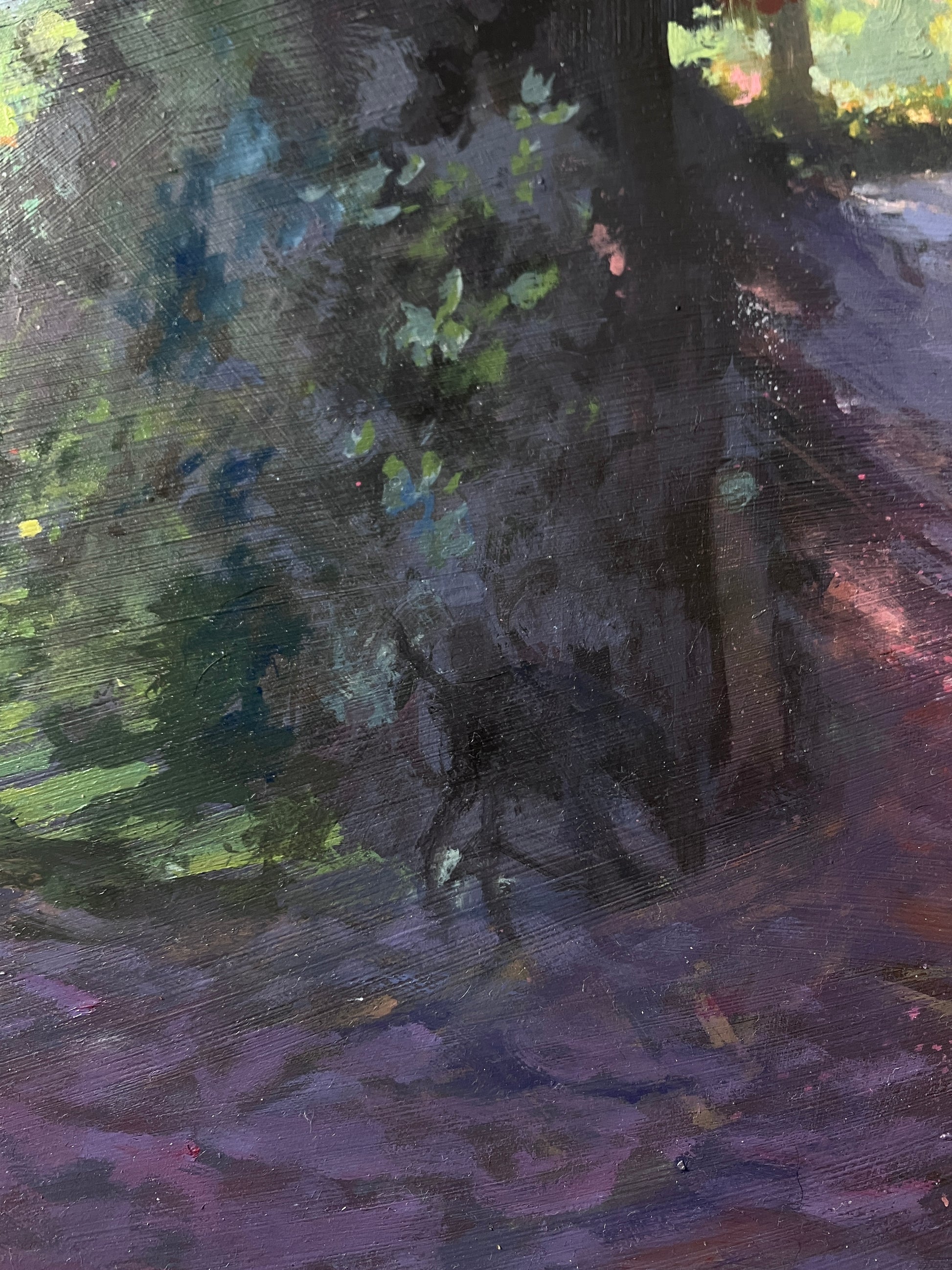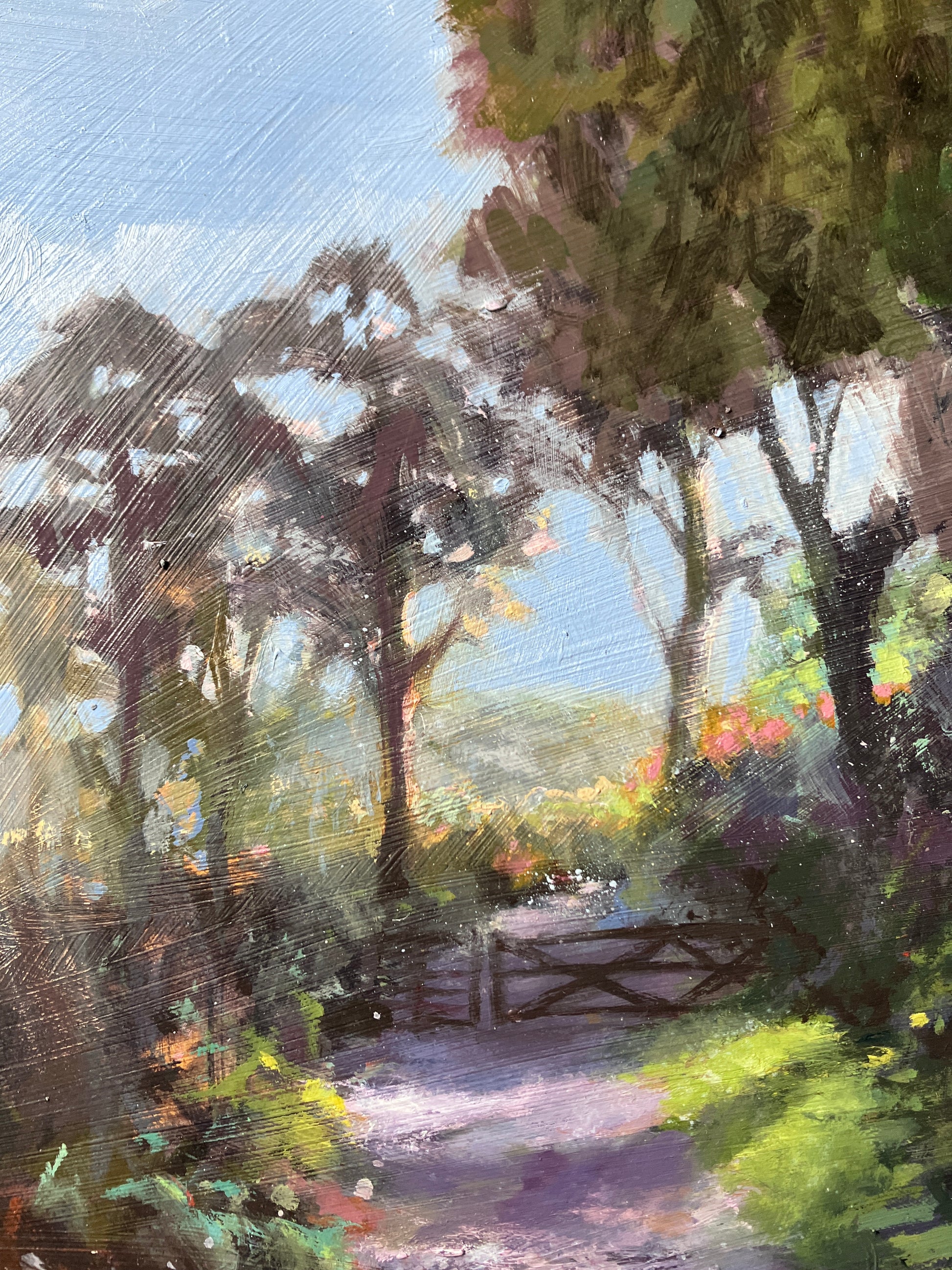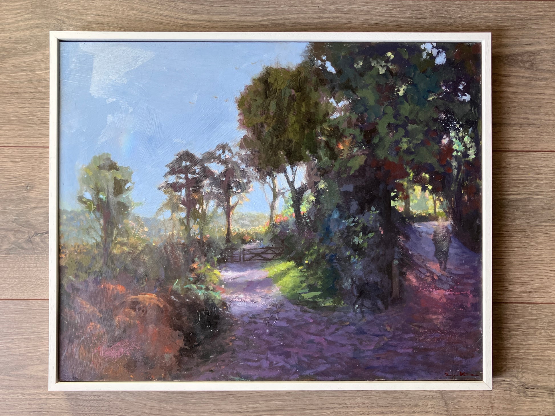 I painted this with the sense that the journey we take through life is shaped partly by the choices we make and partly by chance. There are two paths in this scene and neither are wrong, they just go different ways. There is a vanishing figure on the right, to give a sense of transience and the word 'journey' is written in the paint. It's inspired from the Devil's Punchbowl in Hindhead, a walk I know well with my dog who is also hiding in the painting if you can see him.