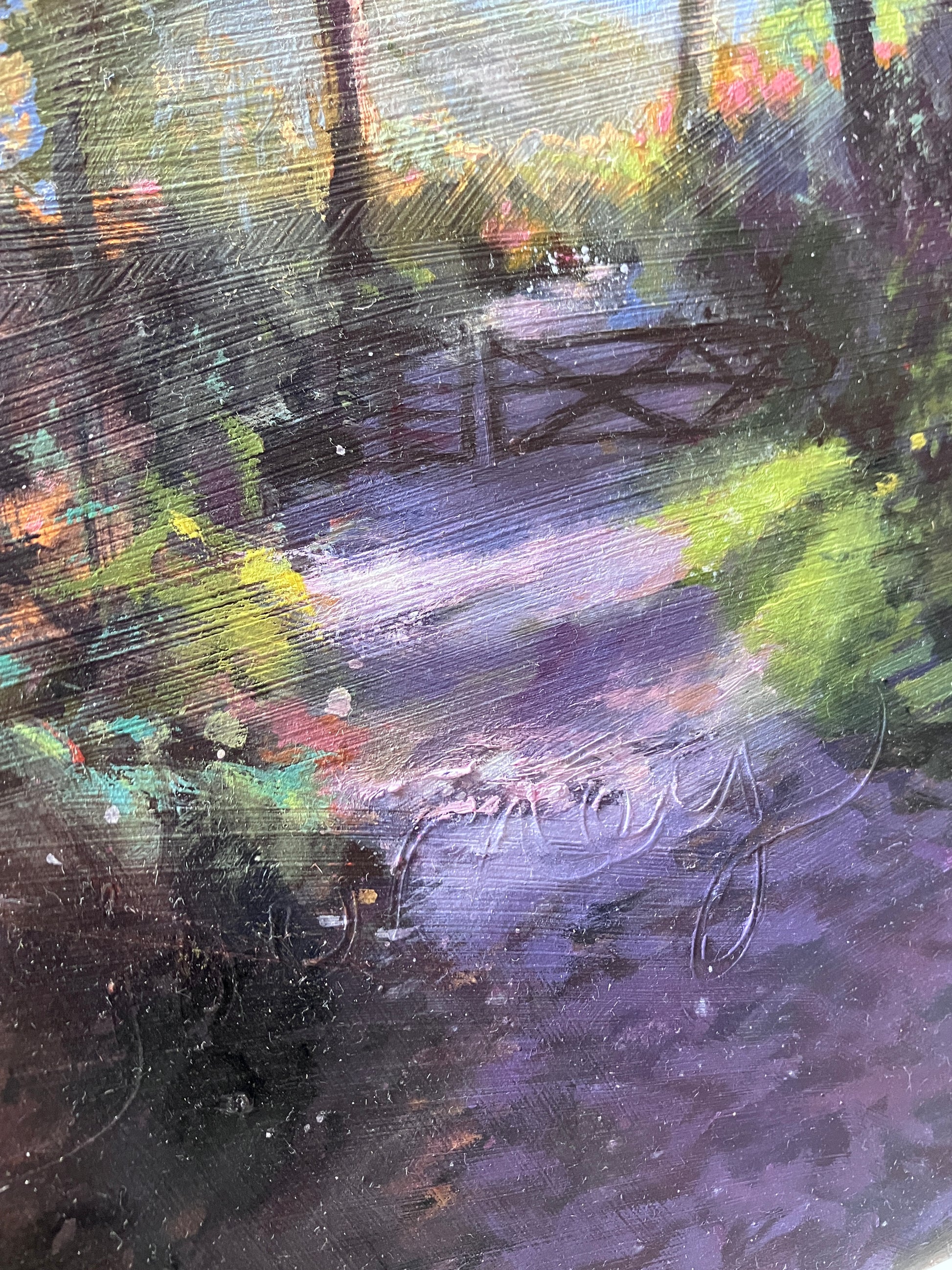 This is an original Sonya Vine painting, oil on board, 16" x 20". Signed by the artist on the front and signed and dated on the back. This comes in a white wooden floater frame so it is ready to hang.